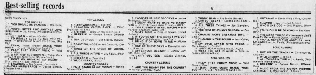 And with that, here’s today’s Top 5: Nothing but the Hits, 9/4/1976. The songs sum up the year quite well, I think, ranging from disco to pop to smooth soul.