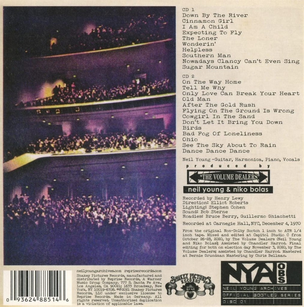 On December 4th and 5th, 1970, he played an early (8:30pm) and late (12am) solo concert at the legendary Carnegie Hall in New York, two days after a six-show stint in Washington, DC, and a few weeks prior to a 23-show solo tour in January ’71. I should mention, I suppose, that the best performances from the DC concerts were released in 2013 as the Live at the Cellar Door album, while 2007’s Live at Massey Hall 1971 and this year’s Young Shakespeare capture special nights from January. One reason for so many recordings of that stretch of concerts: The idea of a live album was being tossed around.