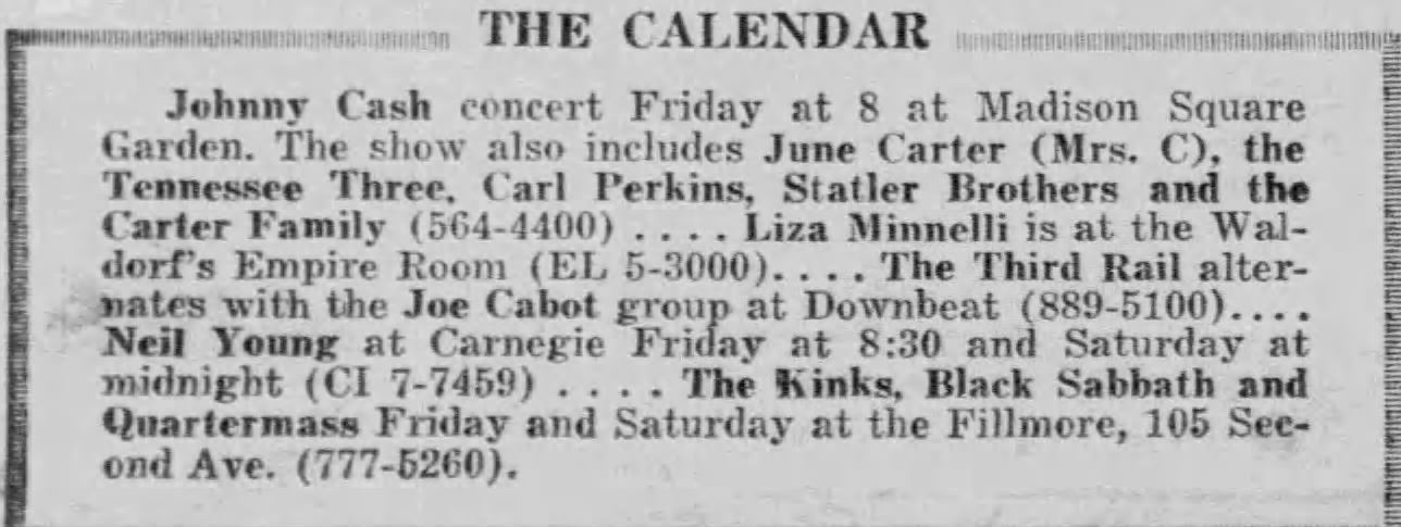 On December 4th and 5th, 1970, he played an early (8:30pm) and late (12am) solo concert at the legendary Carnegie Hall in New York, two days after a six-show stint in Washington, DC, and a few weeks prior to a 23-show solo tour in January ’71. I should mention, I suppose, that the best performances from the DC concerts were released in 2013 as the Live at the Cellar Door album, while 2007’s Live at Massey Hall 1971 and this year’s Young Shakespeare capture special nights from January. One reason for so many recordings of that stretch of concerts: The idea of a live album was being tossed around.