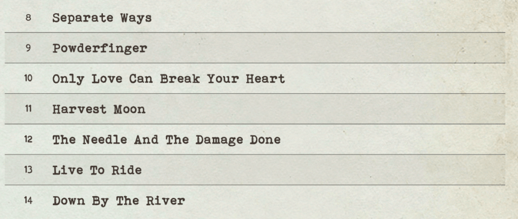 As tape-trading and/or bootleg-buying fans have long known, however, the MGs were more than just “solid and dependable.” They provided utterly brilliant support. For additional proof of that indisputable fact (says I, at any rate), give a listen to the streaming-only release of this concert, which was made available on the Neil Young Archives last September. While Crazy Horse engages in what I’ve come to call “brutal grace,” the MGs provide a sonic tonic of pure soul throughout. They add layers of depth to “Southern Man,” for example, and their support on “Helpless” and “Harvest Moon” lifts those heartfelt songs into the stratosphere. Likewise, “Like a Hurricane” and “Down by the River” soar. They also get down and dirty when need be, such as during the combustible “Live to Ride.”
