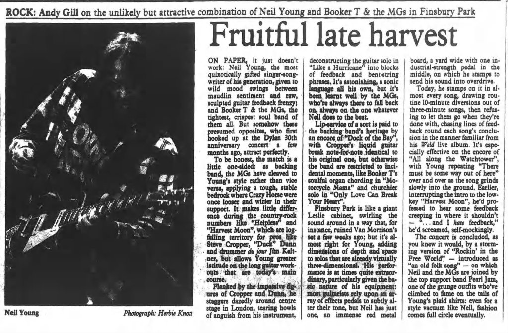 Bell called the combination “bizarre.” Andy Gill of the Independent agreed: “On paper, it just doesn’t work: Neil Young, the most quixotically gifted singer-songwriter of his generation, given to wild mood swings between maudlin sentiment and raw, sculpted guitar feedback frenzy; and Booker T & the MGs, the tightest, crispest soul band of them all.” Bell called the result “solid and dependable,” however, while Gill found the pairing “a little one-sided,” saying that the MGs were “a tough, stable bedrock where Crazy Horse were once looser and wirier in the support.” Still, both enjoyed the show.