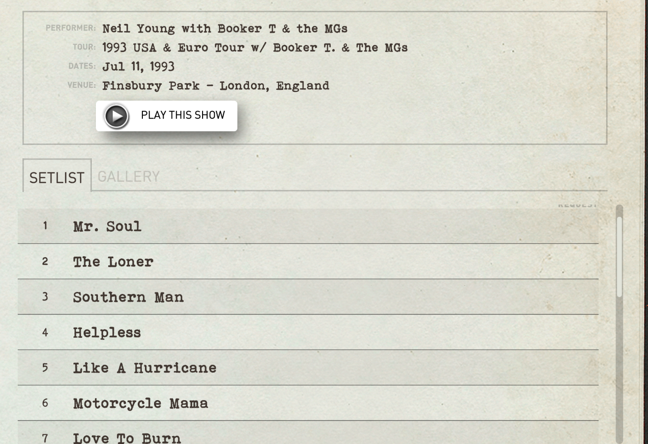 Neil and Booker T & the MGs would join forces again for Neil’s oft-overlooked 2002 album, the soulful Are You Passionate?, of course, and—with Frank “Poncho” Sampredo supplementing the sound—a handful of shows in Europe. There’s something magical and mystical about this concert, however. The sound quality is sublime throughout and the performance is topnotch; I highly recommend it. If you’re a Neil Young Archives member and have yet to do so, press play on it ASAP; and, if you’re not, what are you waiting for?
