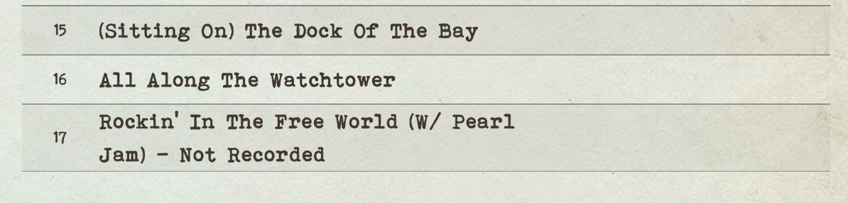 In total, the night consisted of 17 songs, though the night’s last encore (which featured Pearl Jam joining in on “Rockin’ in the Free World”) was lost to time for reasons unknown. The set spans Neil’s career to date, from his Buffalo Springfield days to Harvest Moon, tosses in the unreleased ode to motorcycles, “Live to Ride,” and soulful “Separate Ways,” which wasn’t officially released until Homegrown in 2020, plus a way-cool cover of Otis Redding’s “(Sitting on) The Dock of the Bay,” which was co-written by Cropper. Here’s one fan’s shaky recording of it: