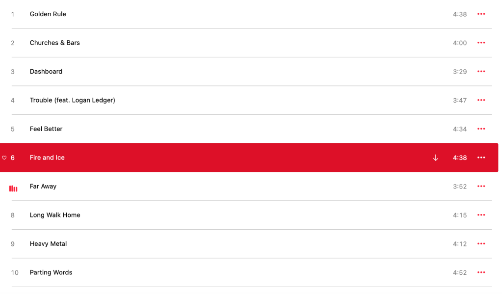 …and much more. “Fire and Ice,” for instance, finds her looking back with the weary wisdom seemingly gleaned from many a Bruce Springsteen song: “My childhood days are over and I’d just give about anything/for tears of joy instead of sad smiles/But fear will cut you like a sword no matter if you’re rich or poor/Don’t let it tear you up from the inside/Don’t let it take the light out of your eyes.“