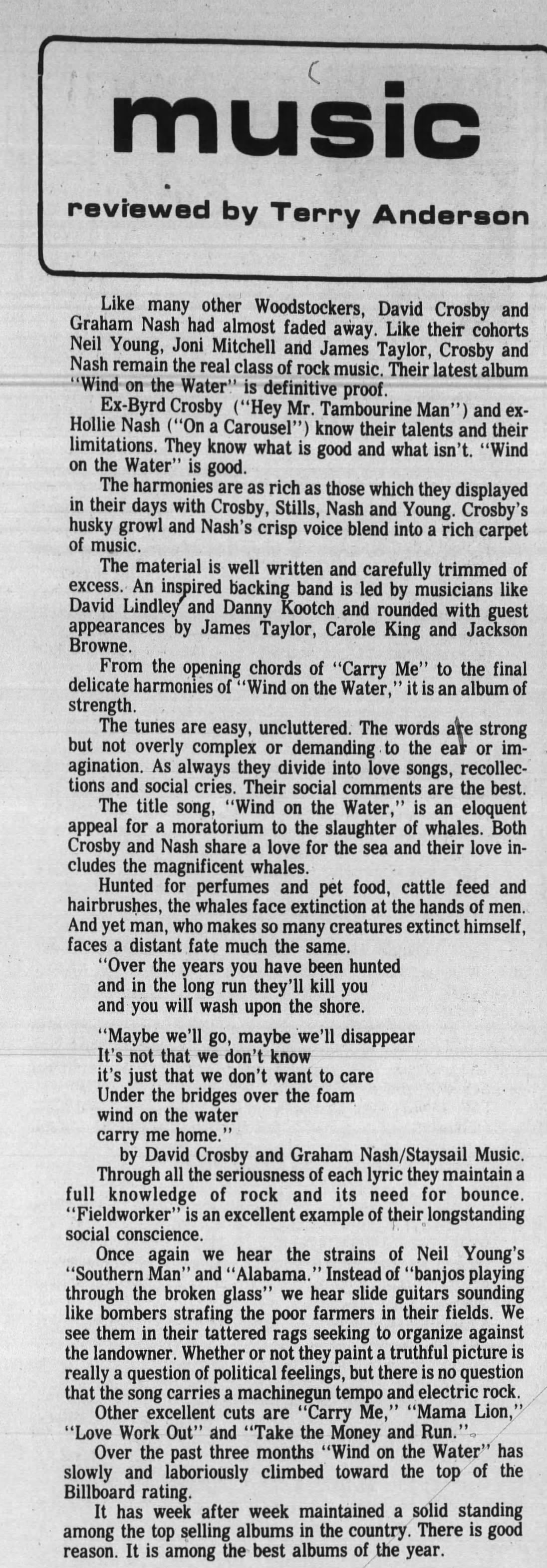 Anyway, the Wind on the Water album was met with positive reactions in most of the contemporaneous reviews that popped up in newspapers in the months following its release. L. Pierce Carson of the Napa Valley Register opined, “This is one of the best albums to hit the market in many a month. Don’t pass it by.” The Columbus (Ga.) Ledger-Enquirer’s David Everette agreed, calling it a “lyrical masterpiece” and summing up with a simple, “If you don’t buy this one, it’s a mistake.” Rich Tozier of the Bangor Daily News chimed in with: “What we find in WIND is a bargain which is all too rare these days: a disc whose every cut fairly leaps with vitality.” A few critics disagreed, of course. In a capsule review, for instance, Dale Anderson of the Buffalo Evening News wrote, “They make for a pleasant way of passing time, but there’s not much substance to stick in your mind.” But the naysayers were few and far between. Even Rolling Stone liked it, with Stephen Holder noting what I said up top, albeit it in more colorful language: “Wind on the Water is not an album made by, for or about kids, but the work of men who face being beached like whales on a sandbar by the youth culture and who are determined to survive. They will.”