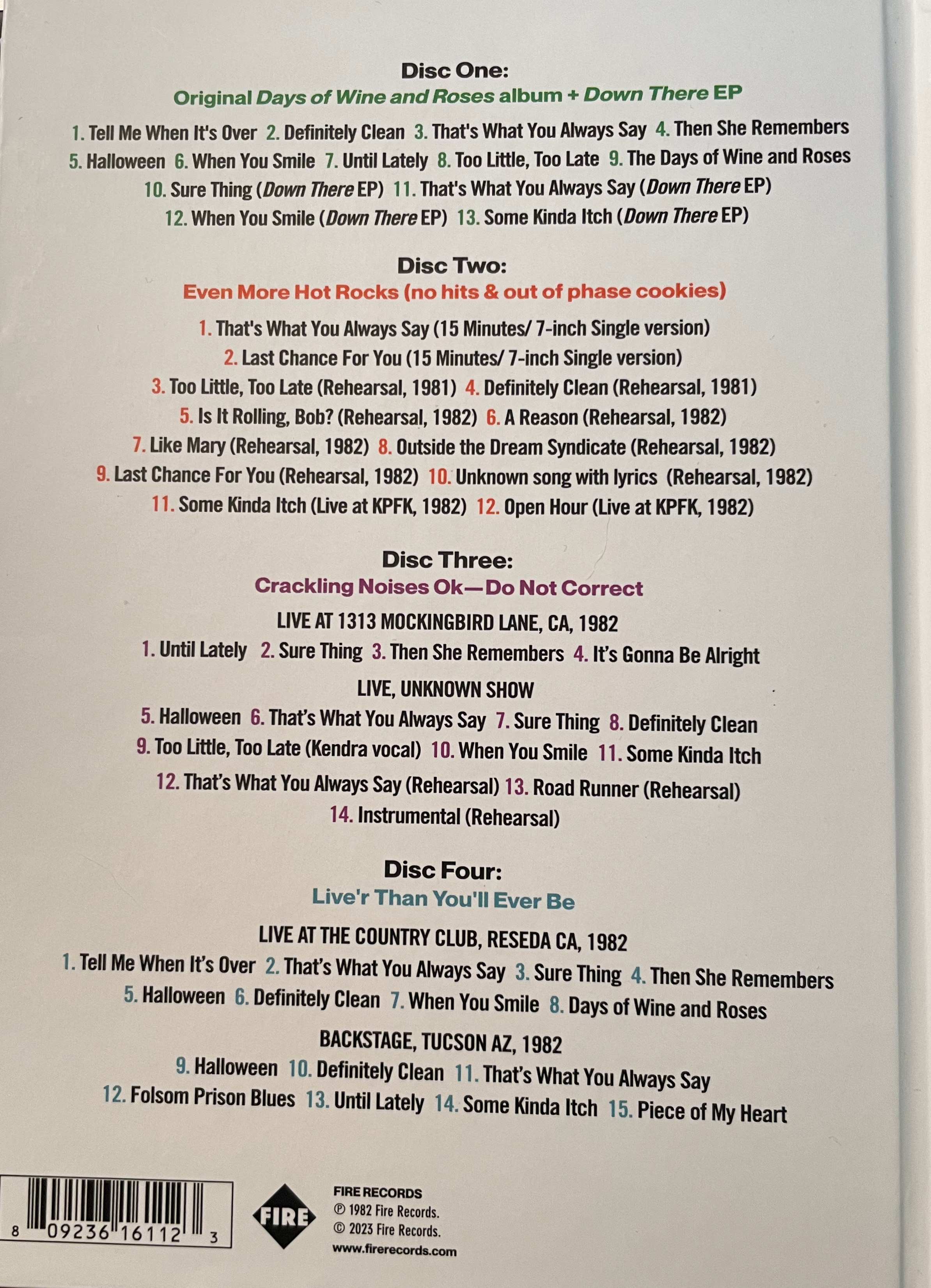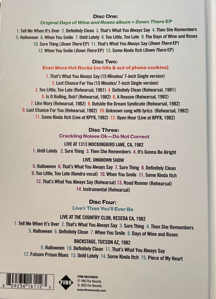 When it comes to music, that means a lot is left out. As I’ve noted before, there was more—much more—to the decade than the singers and bands featured on MTV. History Kinda Pales When It and You Are Aligned: The Days of Wine and Roses 40th Anniversary Edition is a four-disc set curated by counterculture historian and archival music producer Pat Thomas that should hopefully fill in some of the blanks. In total, it’s 54 tracks, including the original nine-song album that was released on October 28, 1982; the Down There EP that preceded it some eight months earlier; the A and B sides of Steve Wynn’s 15 Minutes single from October ’81; and a slew of live and rehearsal sessions, plus two songs lifted from drummer Dennis Duck’s December 27, 1981, audition.