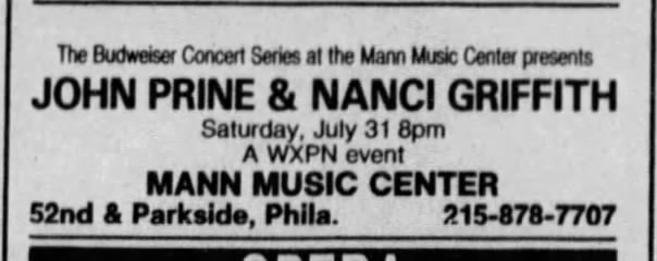 In looking at the track list, what’s amazing to me is the memories it engenders. Through the years, Diane and I were treated to Emmylou covering “It’s a Hard Life” on her Nash Ramblers tour, Iris opening for Nanci, Kathy Mattea singing “Goin’ Gone” on a double-bill with the Nitty Gritty Dirt Band, Nanci in a round-robin with Steve, Emmy and Bruce Cockburn—and, in 1993, John Prine and Nanci co-headlining at the Mann Music Center. They played separate solo sets that night, but also joined each other for several songs. My main non-music memory of the show: the many Pagans—Philly’s version of the Hell’s Angels—in attendance. Who knew they enjoyed contemplative story-songs? One music-related memory: Nanci welcoming a little girl onto the stage to sing “From a Distance” with her. What I didn’t know—or had long forgotten—until this morning, thanks to a contemporaneous Allentown Morning Call review, is that performance was arranged by an organization that grants dying children a wish.