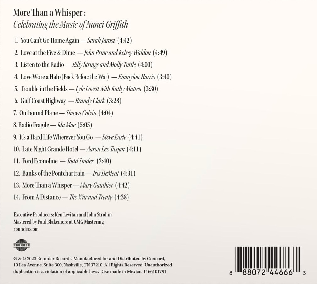 Nothing stays the same—not even, if we’re being honest, our dreams. But these 14 songs, and many more written and performed by Nanci Griffith, are a perfect soundtrack to whatever the future may bring. Give More Than a Whisper a spin, then listen to Clock Without Hands, Flyer, Storms or any of Nanci’s Philo/Rounder albums. They’re great, all.