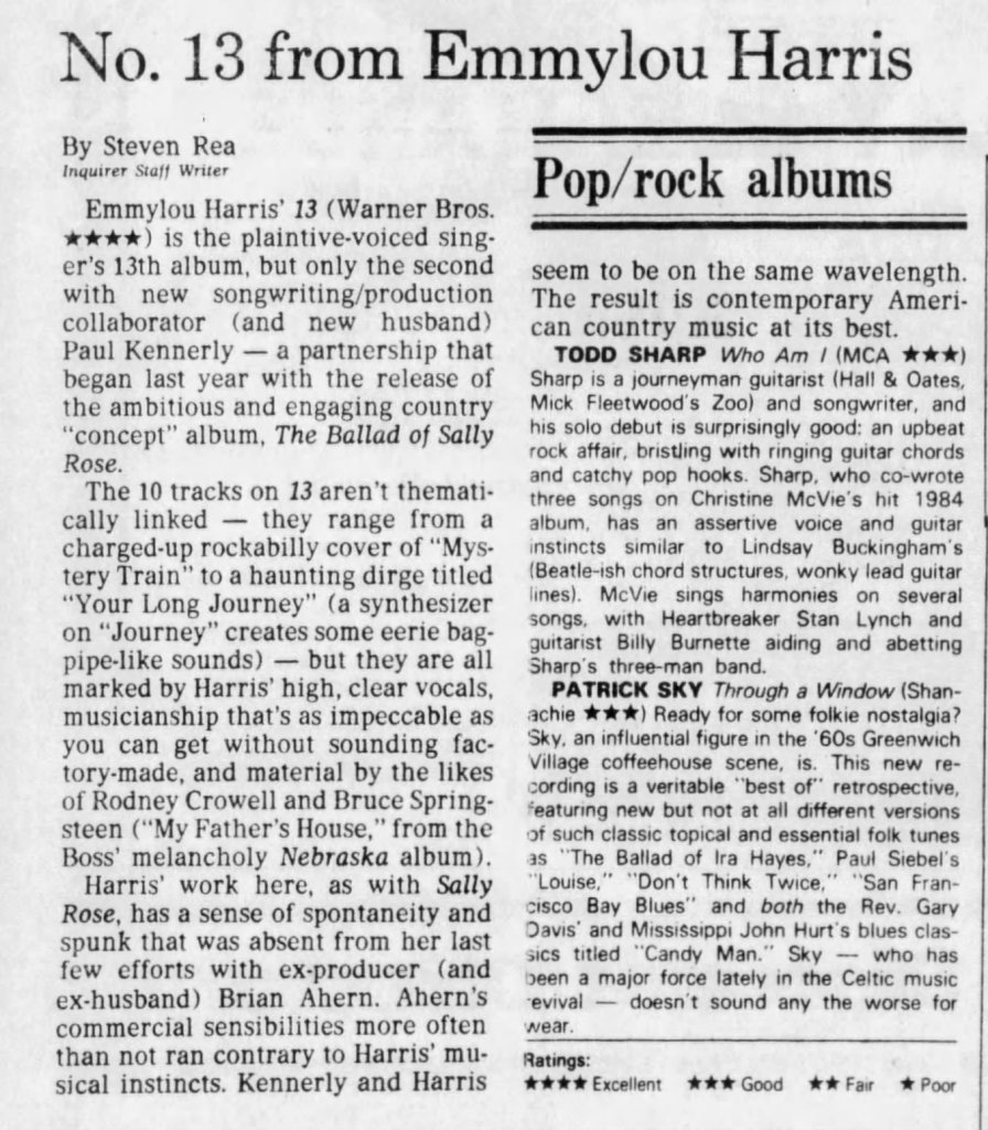 L. Kent Wolgamott of the Lincoln Journal Star, on the other hand, thought that the songs were “never quite as twang as the pure traditionalist sound” and, thus, nothing “really rips it up or tears at the heart.” Ron Chalmers of the Edmonton Journal, however, found much to like, pointing out that Emmylou’ “is enduring evidence that you don’t need lungs like Lanza to sing like a superstar” and that Emmylou’s “melodic sense is rare in an industry awash with market-minded producers and pseudo-musicians from electronics labs.” The Chicago Tribune’s Daniel Brogan, for his part, referenced Emmylou’s efforts to introduce Bruce Springsteen to the country audience in his February 21, 1986, review, citing the Boss songs she’d covered on earlier albums—although he mistook her “Born to Run,” which was written by Paul Kennerley, for Springsteen’s breakthrough anthem!