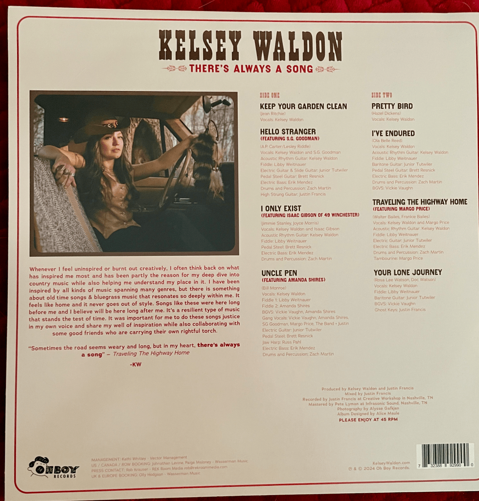 I start with that because, aside from the stretch of pandemic months when most everyone was sitting at home, Waldon’s on the road more months than not. There’s not much time to write let alone record, so when it came time to release a new record the idea of celebrating some of her favorite songs held much appeal—thus, There’s Always a Song. These are, she says, songs that she treasures. As she explains on both Instagram and the album’s back jacket, “Whenever I feel uninspired or burnt out creatively, I often think back on what has inspired me most and has been partly the reason for my deep dive into country music while also helping me understand my place in it. I have been inspired by all kinds of music spanning many genres, but there is something about old time songs & bluegrass music that resonates so deeply within me. It feels like home and it never goes out of style. Songs like these were here long before me and I believe will be here long after me. It’s a resilient type of music that stands the test of time. It was important for me to do these songs justice in my own voice and share my well of inspiration while also collaborating with some good friends who are carrying their own rightful torch.”