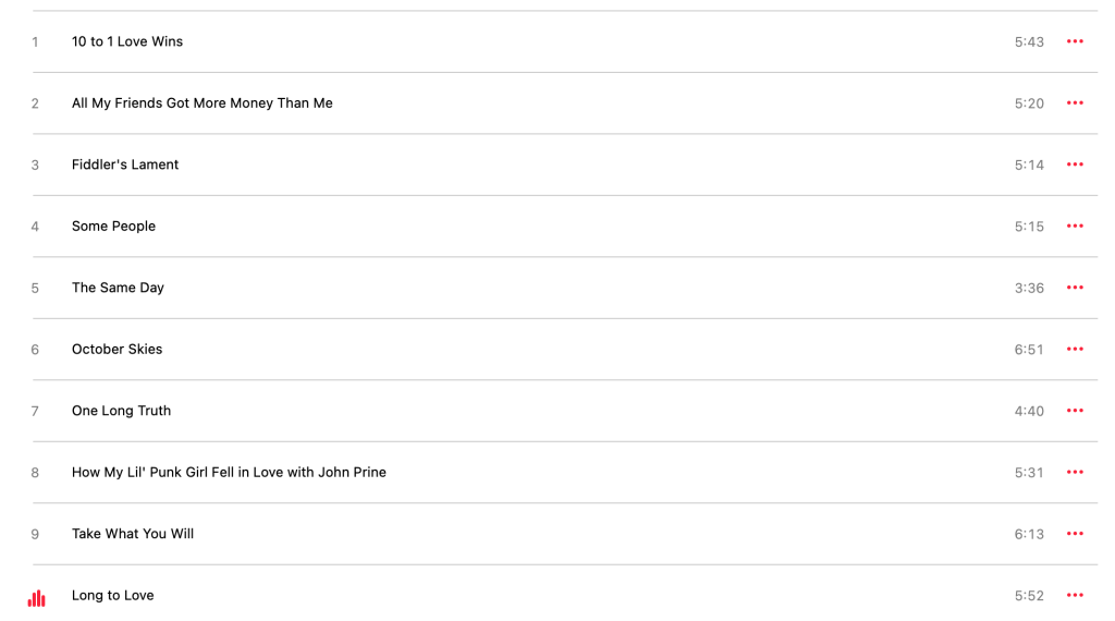 Another highlight is the humorous “How My Lil’ Punk Girl Fell in Love With John Prine,” which Rubinoff wrote about Moore. (Most songs here were inspired by her.) It’s folky and funny, and sure to spur a singalong in concert.