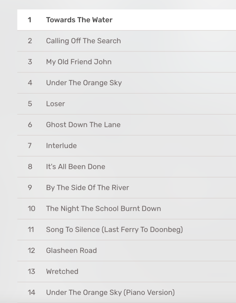 “By the Side of the River” opens with a strummed acoustic guitar before the band joins in, while Sheehy spins back to a time when he thought he’d never leave his hometown. “The Night the School Burnt Down,” as I noted above, explores how the past lingers in the present. “Song to Silence (Last Ferry to Doonbeg)” does much of the same, but via a remembrance of a once-close pal who faded away. “Glasheen Road” revisits the same era, when money was tight—and friendships, too. “I know that nothing lasts forever, but I hope I’ll be seeing you soon,” he sings. The penultimate track, “Wretched,” builds to a cathartic frenzy, before the piano-only version of “Under the Orange Sky” revisits the album’s overarching theme.