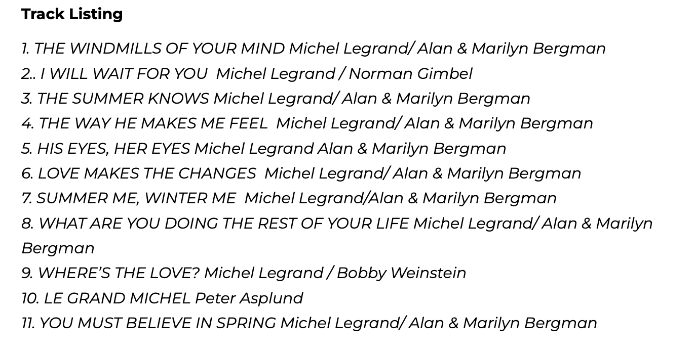 Another example: In “I Will Wait for You,” she hands off to Asplund for a heartfelt solo before stepping back to the fore; that, by the way, is one of two Legrand collaborations with lyricists not named Bergman. (See below for the full breakdown.) Another highlight is “The Way He Makes Me Feel,” a standout from Yentl; rather than compete with Barbra Streisand’s soaring vocals or the original’s orchestral accompaniment, she and Sjöstedt—who arranged the songs—turn it into an internal dialogue: “There’s no chill, and, yet I shiver/There’s no flame, and, yet I burn/I’m not sure what I’m afraid of/And, yet I’m trembling.” It’s quite captivating.