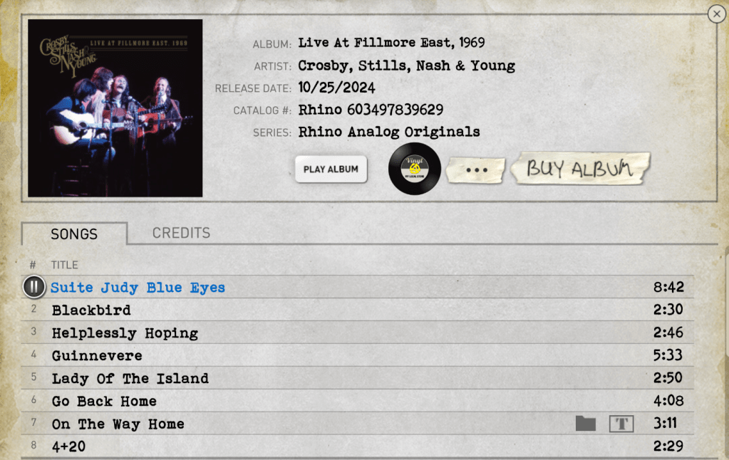 Live at Fillmore East, 1969 captures the magic. The first half is acoustic, the second electric, while the sound—overseen by Stills, Young and John Hanlon—is pristine. Everything I’ve read indicates that it hails from the late show on the 20th. If the Neil Young setlist site Sugar Mountain is accurate, then, a few songs were left out and the set order tweaked—similar to what Young did with his archival Young Shakespeare a few years back. Between-song patter is also excised.