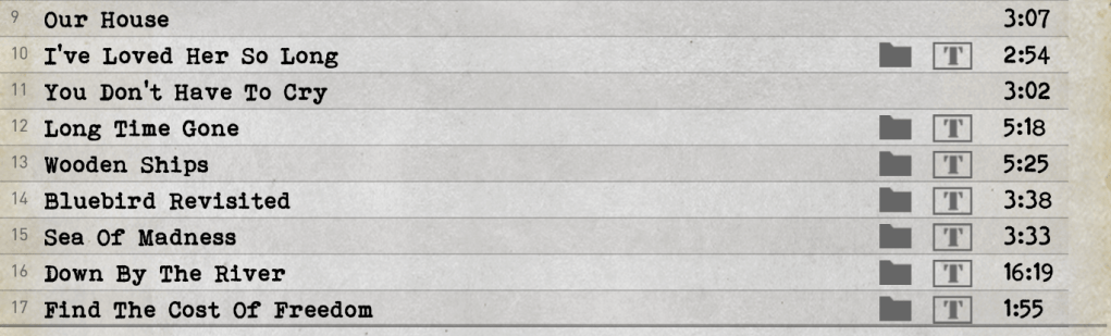 The electric section is as fine, if a tad more ragged, with Crosby singing his heart out on “Long Time Gone,” and the band sailing into the sky on “Wooden Ships.” The highlight, however, is a riveting 16-minute “Down by the River” that floods the brain with dopamine.