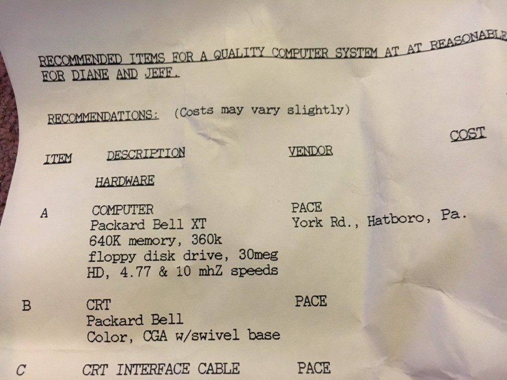 Diane and I purchased our first computer in 1991, a secondhand x286 IBM clone that ran the DOS operating system. It boasted a 30mb hard drive, 640 kilobytes of memory, a 5 1/2-inch floppy disc drive, and an internal 1440-baud modem. My dad, who was far more tech oriented than either of us, did the heavy lifting, scouting PC stores that stocked new and refurbished models, and then creating a list of recommendations that fit our modest budget. I came across that one-sheet a few years back, while packing for a move: