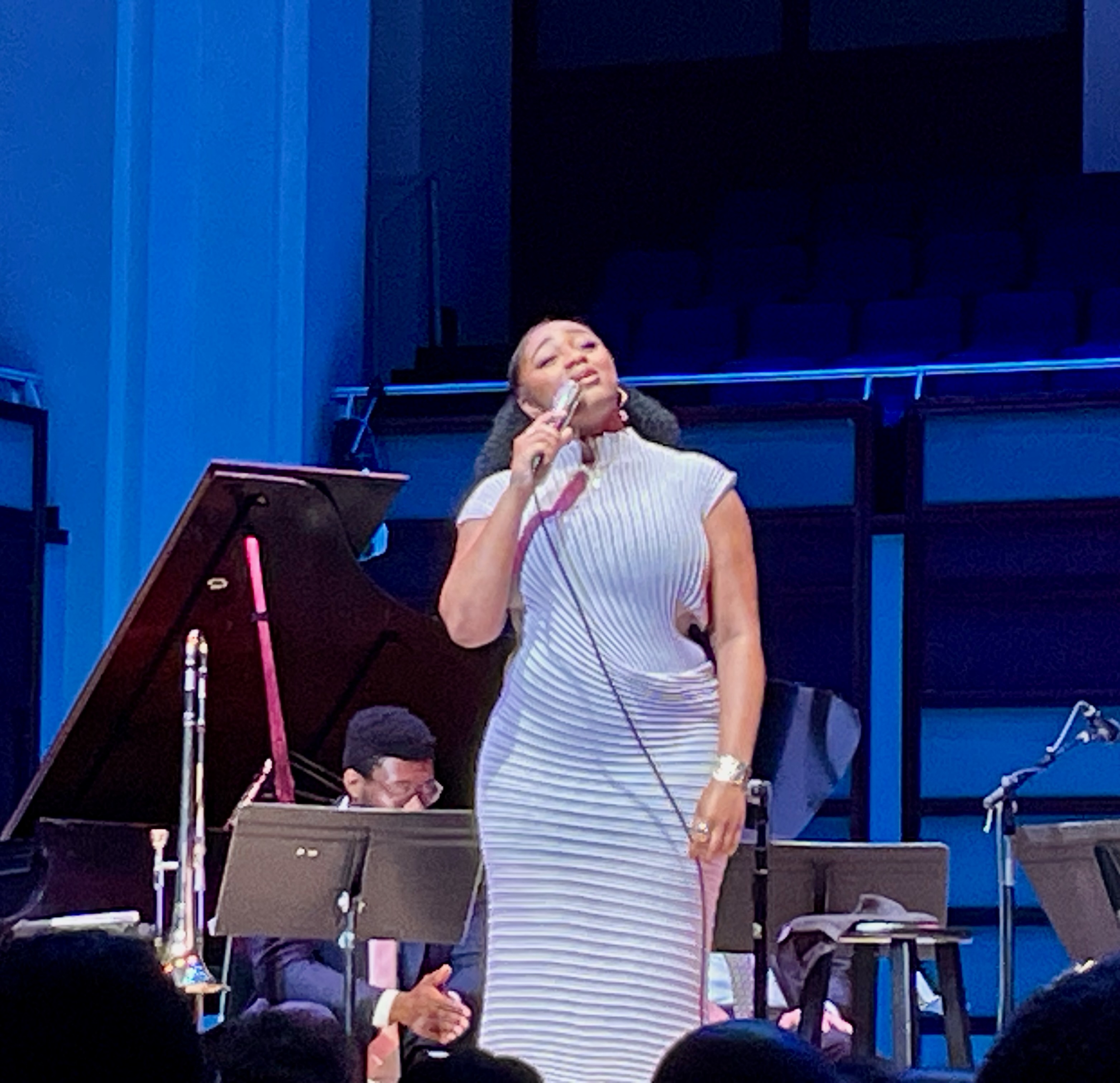 In the Center’s spacious Meymandi Concert Hall, where empty seats were a rarity, the 25-year-old Joy and her six-piece band delivered a spellbinding set that conjured Ella Fitzgerald, Sarah Vaughan and Billie Holiday, among other long-ago greats. The magic commenced with “‘Round Midnight,” the Thelonious Monk classic recorded by everyone from Miles Davis to Charlie Parker. Her liquid vocals, like the rain on the ride in, drenched the environs, scattering high one moment and pitter-pattering low the next. (Ponding, at least for this metaphor, was a non-factor.) She effortlessly extended syllables into seamless notes that simultaneously cloaked and cushioned the heart and soul.