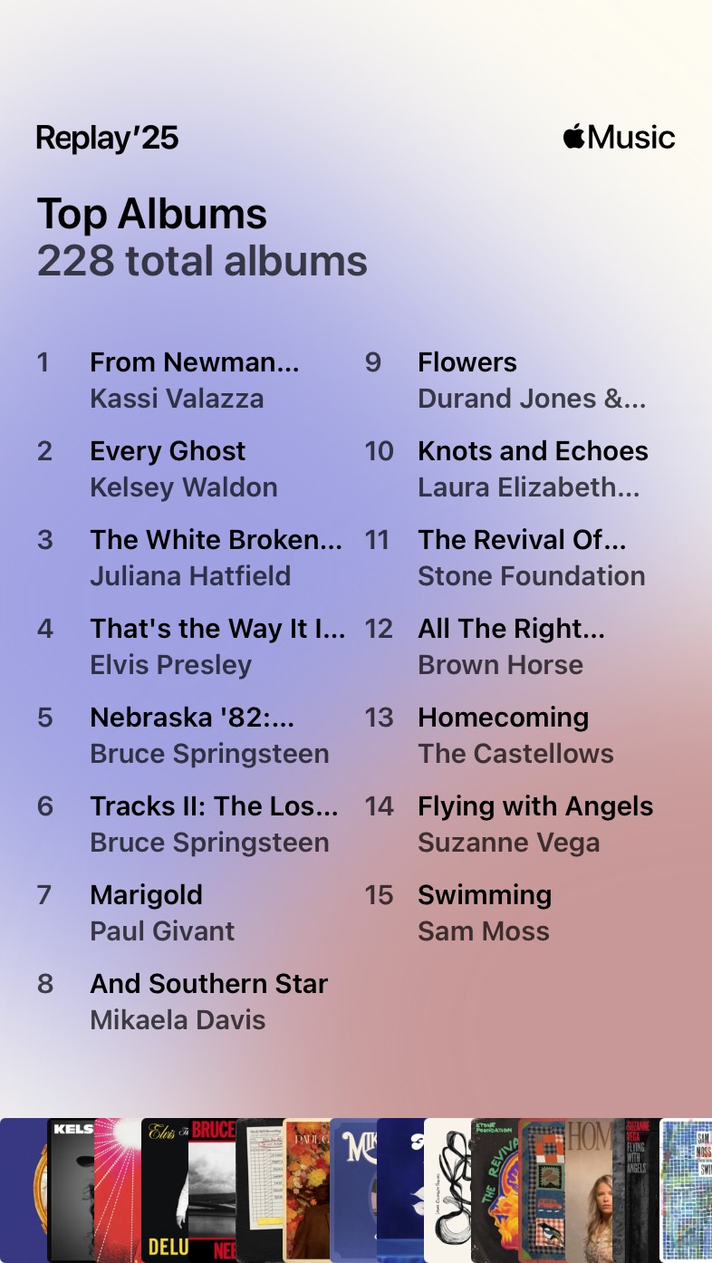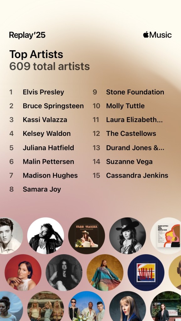 That said, the Apple Music Replay stats—though obviously diluted—are a good representation of my listening year, which included a plethora of new(er) favorites listed alongside my old standbys—Elvis Presley and Bruce Springsteen, primarily. (Paul McCartney and Neil Young, among others, would be listed, as well, if not for my fragmented listening habits). I consider each and every song, whether recent or from long-ago, a blessing.
