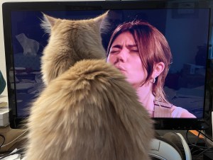 For now, however, I’m lost in a 75-minute Hayley Reardon concert posted to YouTube last week. Diane and I watched it Thursday night on the big-screen TV in the living room; now I’m watching it at my desk, though—as the picture shows—the Magnificent Mister Mo is blocking my view. It’s as mesmerizing the second time through as the first.