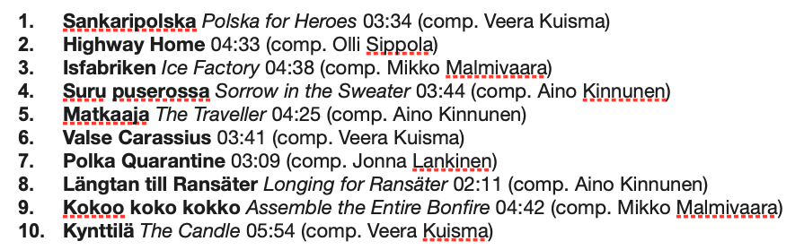 That said, it’s not entirely uptempo. The stirring “Suru puserossa,” for instance, encapsulates the sonic strains of grief, while the equally moving title track conjures the plight of pilgrims (or maybe just life on the road), “Valse Carassius” glides on outstretched wings across the sky, and “Kokoo koko kokko” spurs smoke to swirl from the speakers. It’s a wonderful collection.